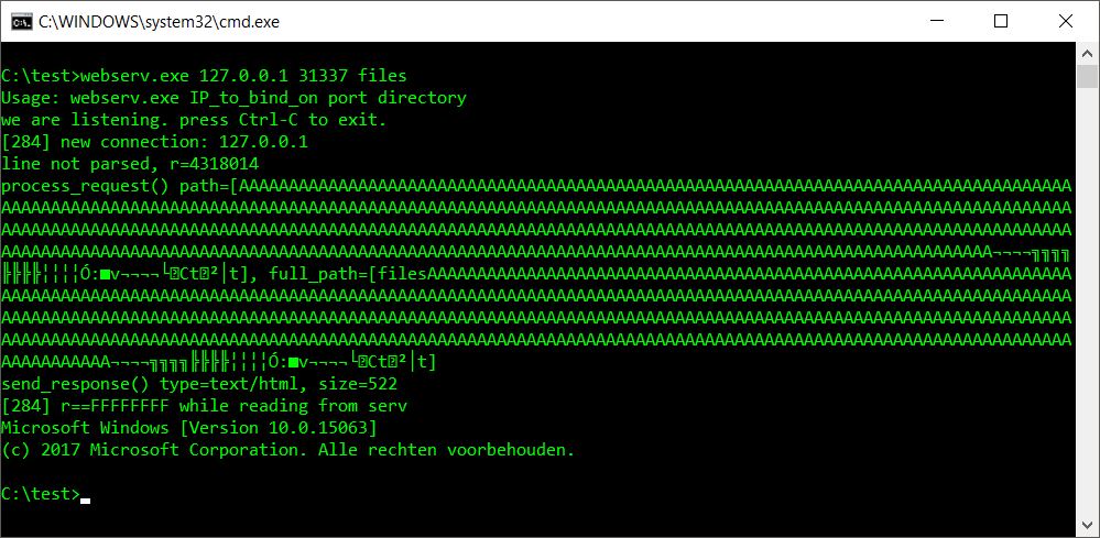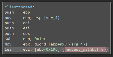 So, in essence: 100000 bytes read from the socket are being shoved into 2048 bytes on the heap and then into 400 bytes of buffer on the stack. By writing a stream of 416 trash bytes and then the value we want our function to return from; we can modify the instruction pointer and alter the flow of instructions in the HTTP-server, possibly executing malicious code.