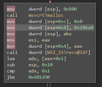 Using static analysis to chase through the program, we can see that after the socket initialisation code the main thread starts waiting for listen(). When a client connects, a new thread is spawned from entry point 0x401c50. This function allocates a buffer on the heap of 2048 bytes, but attempts to read 100000 bytes, which overflows the buffer.