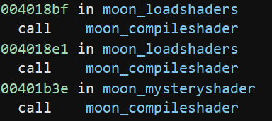 A quick Google search turned up that this is GLSL: the OpenGL Shader Language. In the executable, these are loaded with glCreateProgram() and glCompileShader(). The program calls glCompileShader() once, in a sub at 0x401770, which we’ll call moon_compileshader. A string reference saying glCompileShader: %s in this sub confirms this. What got me curious is that we’ve found two shaders in the strings, but moon_compileshader is actually called 3 times: