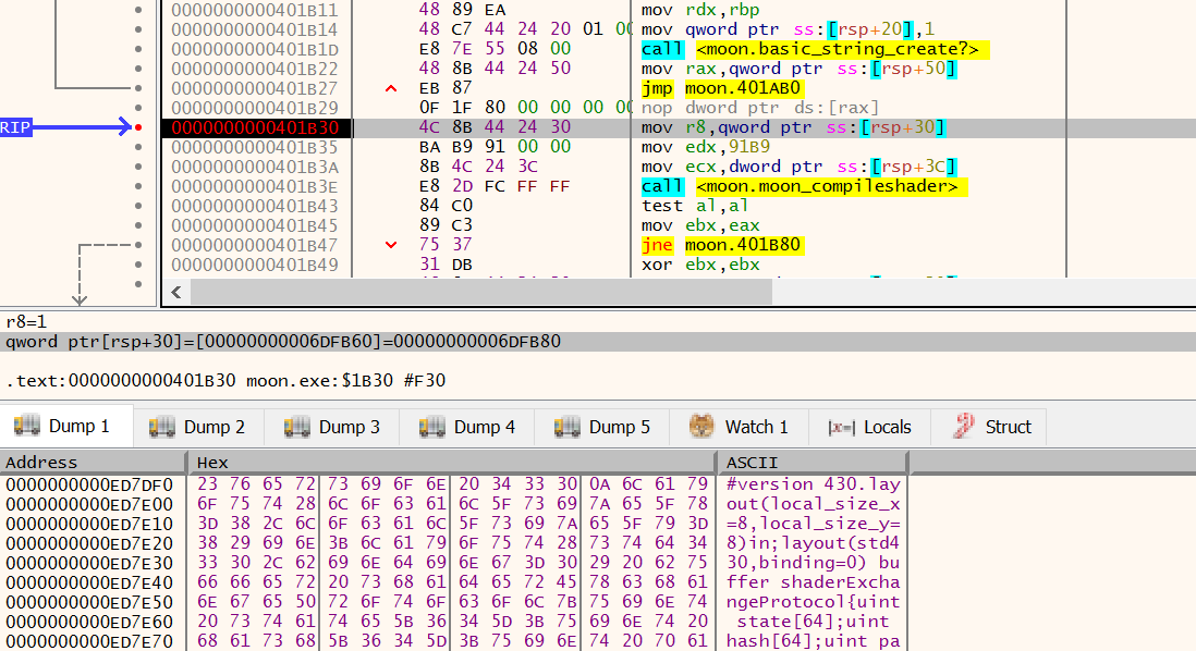 The third time is in a function we’ll call moon_mysteryshader. This function seems to decode some constant in steps and save it into a std::basic_string. I let x64dbg run through the function and sure enough, another piece of shader code shows up: