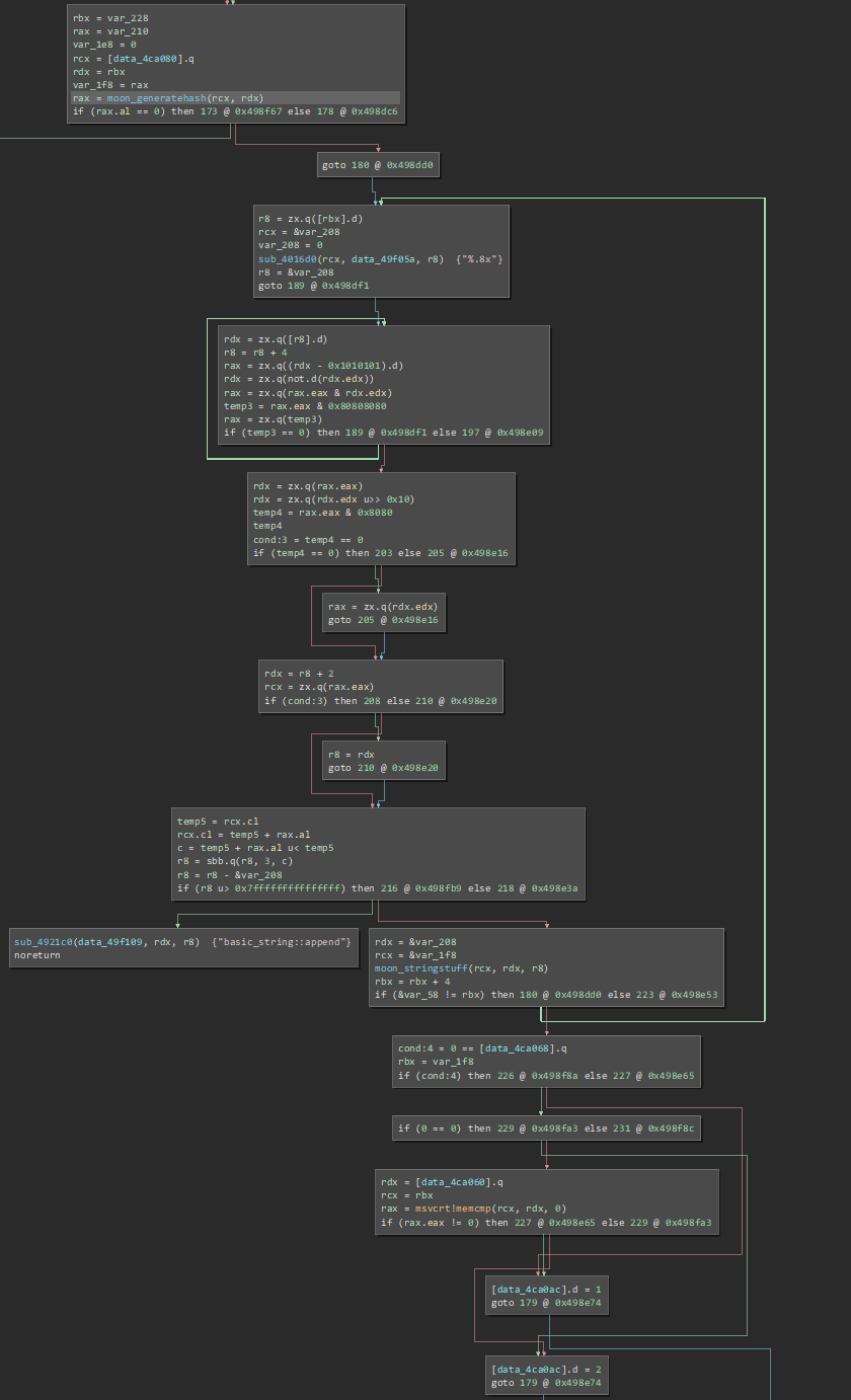 But we need to find out what it is being checked against. At 0x401bf0 there is a function that runs the shader program, lets call that moon_generatehash. Finally, in moon_main a string is constructed and then a memcmp() is called. This verification code looks like this (in Binary Ninja medium IL):